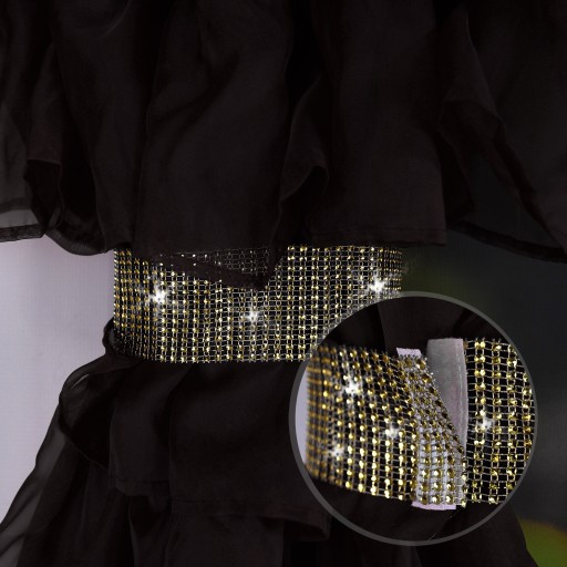 Firany wykonane są z woalu, udekorowanego falbankami. Do zestawu dołączone są dwie tasiemki umożliwiające upięcie firan w kokony, w kolorze złotym. Uniwersalna tkanina jest niezwykle trwała i pięknie się układa.