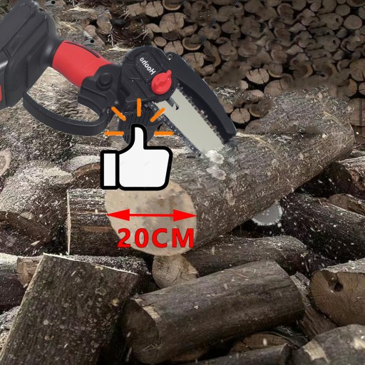 - Nasza akumulatorowa mini pilarka łańcuchowa z blokadą bezpieczeństwa wymaga pomocy naciśnięcia tych zabezpieczeń i wbudowanego włącznika w celu uruchomienia pilarki, co pozwala skutecznie włączyć nieprawidłowe działanie i włączyć zabezpieczenia.