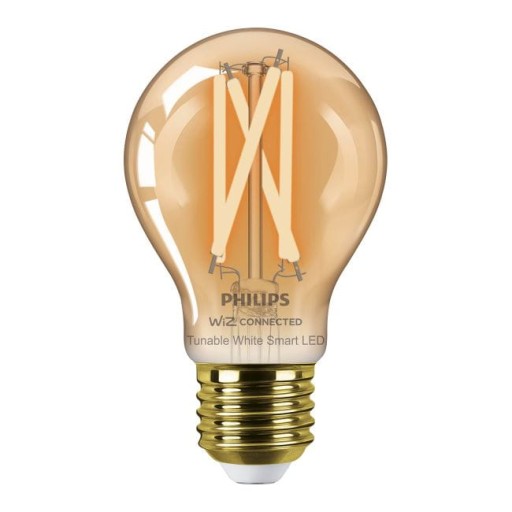 Inteligentna żarówka Philips LED E27 w kształcie tradycyjnej żarówki żarnikowej z bursztynową powłoką pozwala rozświetlić przestrzeń ciepłym lub chłodnych światłem białym. Możesz nią sterować za pomocą aplikacji WiZ lub głosem w istniejącej sieci Wi-Fi