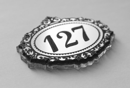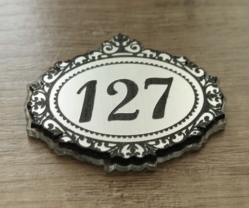 - Numerek wykonujemy techniką grawerowania laserowego na wysokiej jakości laminacie grawerskim o grubości 1,6 mm, przyklejonym do pleksi grubości 3mm.