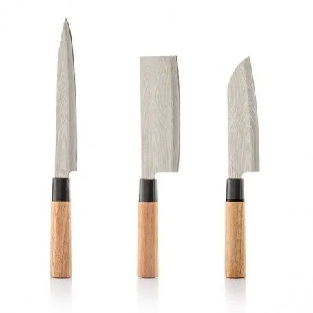 Zestaw zawiera 3 rodzaje noży: do filetowania, tasak (do szatkowania) oraz santoku (do krojenia w kostkę warzyw, mięsa lub ryb).