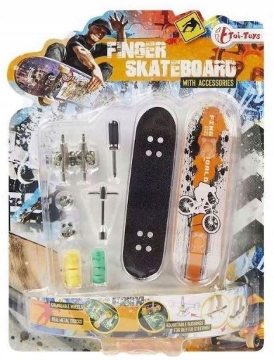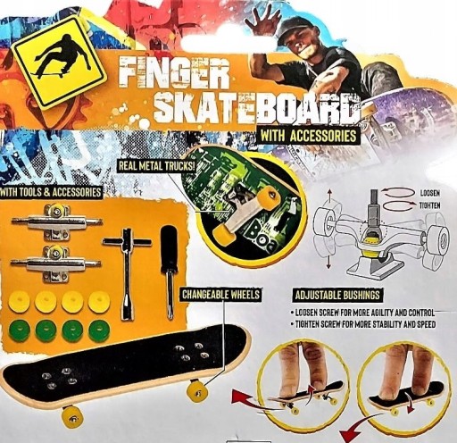 Miniaturowa deskorolka do jazdy palcami wraz z akcesoriami do samodzielnego montażu.