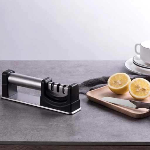W celu łatwiejszego użycia posiada wygodny uchwyt. Jedną ręką się o niego opieramy a drugą prowadzimy nóż przez ostrza.
