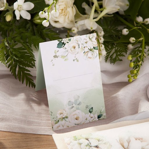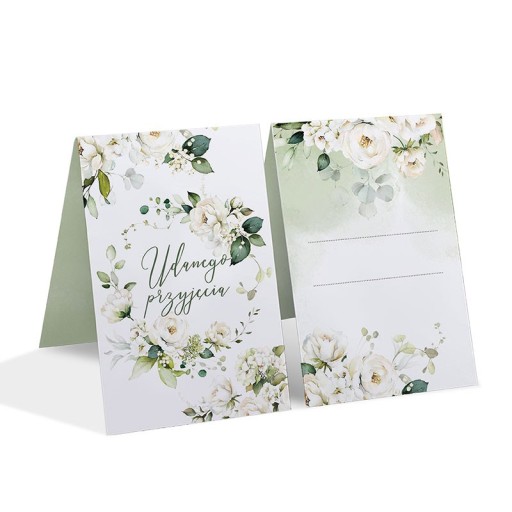 - nadruk: dwustronny matowy, kwiatowa grafika białych róż w odcieniach bieli i zieleni, napis "Udanego przyjęcia!; miejsce do uzupełnienia nazwisk gości