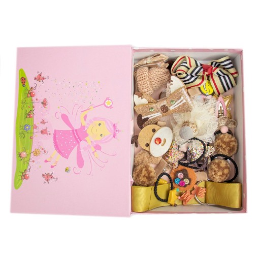 - Inne szczegóły: zestaw zawiera 13 spinek i 6 gumek, 4 żabki, 1 wstążkę, zestaw znajduje się w opakowaniu ozdobnym o wymiarach 12,5 cm x 17,5 cm