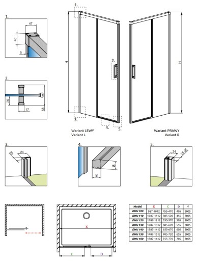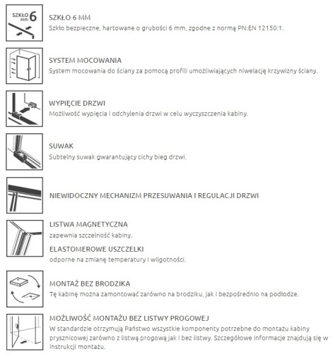 Wszystkie produkty z serii Idea zawierają wszelkie niezbędne części potrzebne do montażu zarówno z listwą progową jak i bez listwy progowej.