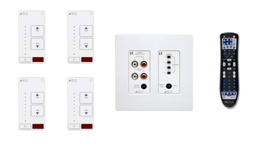 System ścienny 1-źródłowy. W skład zestawu wchodzi: pilot zdalnego sterowania z funkcją uczenia, 2 klawiatury A-K4, naścienny HUB A-H4D.