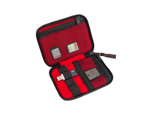 - wewnątrz gumki na 4 pendrivy oraz dwie komory za prześwitującą siatką na karty SD lub inne drobne akcesoria