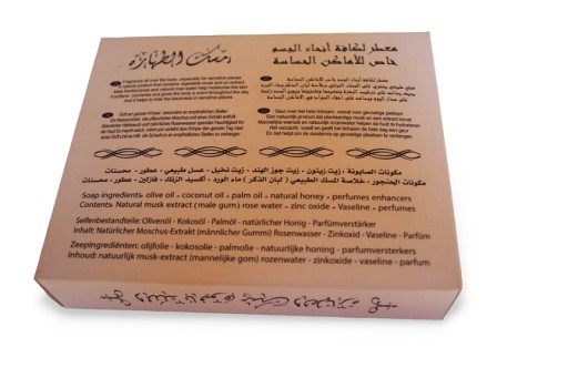 - Składniki (INCI) mydła: oliwa z oliwek, olej kokosowy, olej palmowy, miód naturalny, perfumowane naturalnym koncentratem musk, woda różana, wazelina kosmetyczna