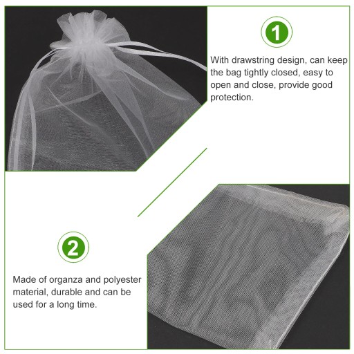 Ta torba może uniknąć uszkodzenia owoców przez owady, ptaki lub inne dzikie zwierzęta. Dobrze dobrana organza premium, materiał poliestrowy, bardzo i niełatwy do uszkodzenia, zużywający czas i mocny. Może być stosowany do wielu rodzajów owoców.