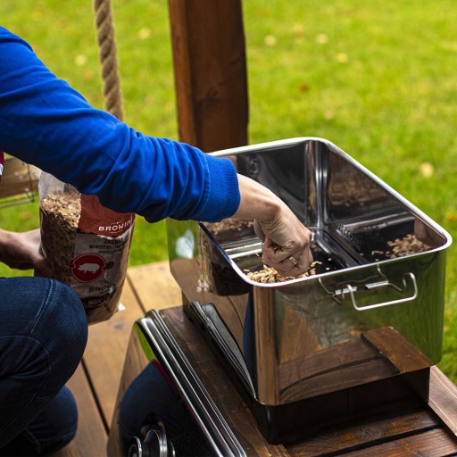 W procesie wędzenia niezbędne jest użycie zrębków wędzarniczych. Zalecamy wkład zrębek w ilości ok. 60 - 80 g (dwie większe garści), co pozwoli na uniknięcie przekwaszenia potrawy.