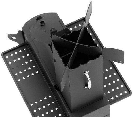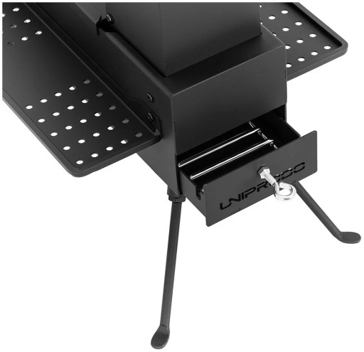 Piec rakietowy marki Uniprodo sprawdzi się w ogrodzie czy na kempingu. Oferuje dwa miejsca do gotowania. Można na nich użyć kociołków i patelni żeliwnych oraz podobnych sprzętów wytrzymujących wysokie temperatury. Jako paliwo mogą być używane drewno, węgiel oraz pellet. Są one podawane do pieca od góry lub z boku przez dwa otwory. Zamknięty system z wysoką rurą kominową skupia ciepło, dzięki czemu wykorzystywane jest do gotowania, pieczenia lub grillowania. Nad rurą znajduje się otwarta półka zbudowana z dwóch krzyżujących się elementów, na której można bezpiecznie postawić patelnie i garnki. Piec można złożyć i bezpiecznie transportować w dowolne miejsce za pomocą uchwytu. Cztery nogi zapewniają mu stabilność. Po bokach znajdują się dwa miejsca do przechowywania sprzętu do gotowania, talerzy lub dań gotowych. Popiół usuwany jest boczną komorą, co ułatwia utrzymanie czystości.