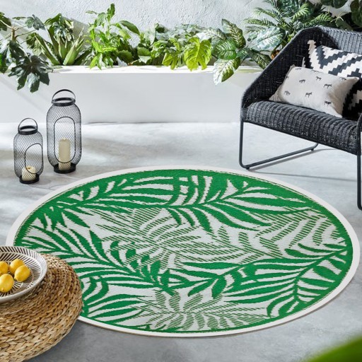 Dywan wykonany jest z gęsto plecionych żyłek z tworzywa sztucznego (100% polipropylen). Dzięki zastosowaniu takiego materiału jest wodoodporny, nie chłonie wody i szybko wysycha po opadach deszczu. Dywan idealnie nadaje się na zewnątrz, jest odporny na różne warunki pogodowe i idealnie sprawdzi się w sezonie letnim na tarasie, balkonie czy w ogrodzie.