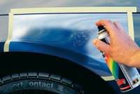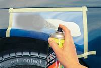 Zabezpieczamy naprawiany obszar za pomocą foli lub taśmy lakierniczej. Następnie nakładamy w odstępach 5-10 minut kilka cienkich warstw podkładu. Wyschnięty podkład wygładzamy drobnym papierem na mokro.