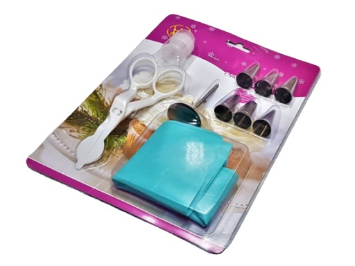 Zestaw zawiera: 6 różnych tylek cukierniczych, podstawkę (tzw. gwóźdź), adapter do tylek, rękaw cukierniczy wielorazowego użytku, nożyczki do przenoszenia ozdób.