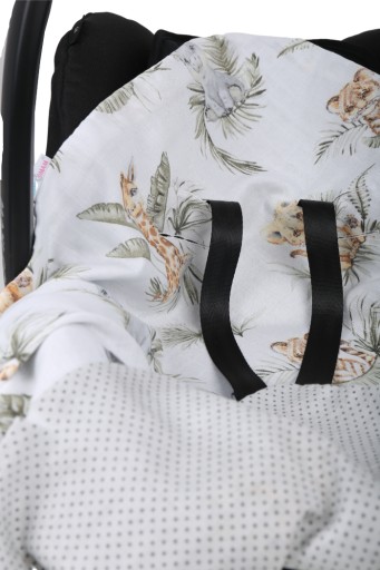 Kocyk ma regulowane otwory na każdy rodzaj pasów (nosidełko, wózek, fotelik, krzesełko). Nasz kocyk zbudowany jest z 2 warstw puszystego i lekkiego muślinu, jest dwustronny tzn, że możesz go założyć jak lepiej ci się podoba.
