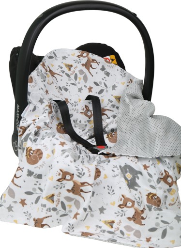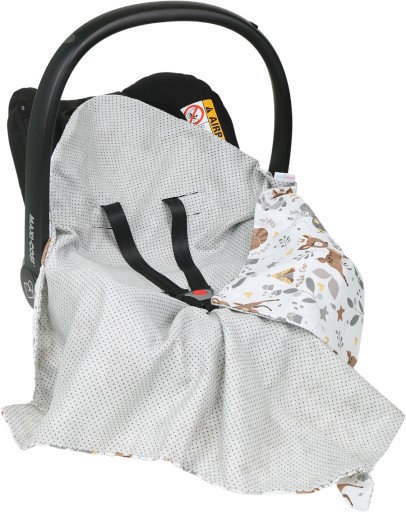 Kocyk ma regulowane otwory na każdy rodzaj pasów (nosidełko, wózek, fotelik, krzesełko). Nasz kocyk zbudowany jest z 2 warstw puszystego i lekkiego muślinu, jest dwustronny tzn, że możesz go założyć jak lepiej ci się podoba.