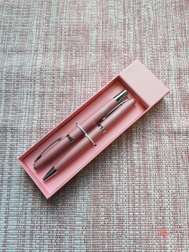 Przybory piśmiennicze wykonane z metalu, etui z mocnej tektury wykończonej kolorowym papierem, różowa tabliczka z personalizowanym grawerem - idealny sposób na wyjątkowy prezent!