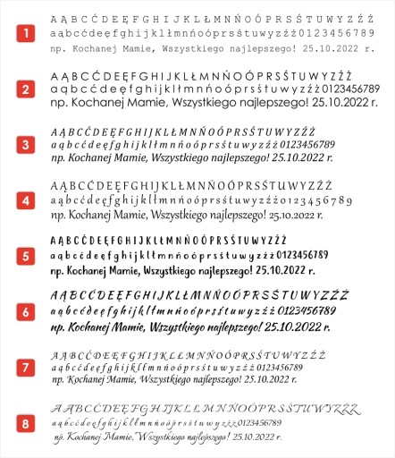 WAŻNE! W przypadku podania treści BEZ WSKAZANIA KONKRETNEJ CZCIONKI wyboru dokona grafik dostosowując najpopularniejszą/ najbardziej odpowiednią czcionkę do tekstu!