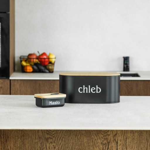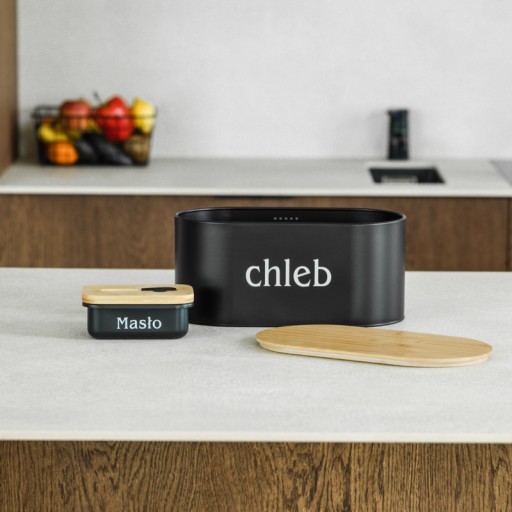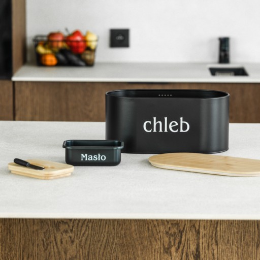 Zestaw CHLEBAK Z DESKĄ DO KROJENIA I MASELNICZKA Z NOŻEM czarny na pieczywo