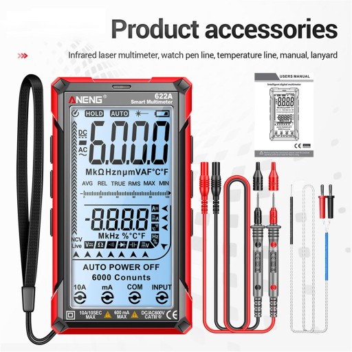 Wiele funkcji pomiarowych: pojemność, włączanie i wyłączanie, wyświetlanie VA, laser na podczerwień i napięcie prądu stałego oraz prąd stały, napięcie prądu stałego miliwolt i prąd stały miliwolt, wartość maksymalna/minimalna, temperatura °C/°F, antykorozyjna kropla silikonu, auto wyłączenie zasilania, Hz/cykl pracy. Oświetlenie latarki, indukcja bezkontaktowa, identyfikacja przewodów, przechowywanie danych.