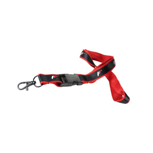Czerwona smycz z czarną taśmą z nadrukowanym logo Japan Racing Wheels i czarnym karabińczykiem.