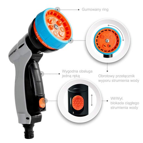 Wielofunkcyjny pistolet zraszający łączy nowo opracowany system ciągłego podlewania ze zintegrowaną blokadą i łatwą obsługą jedną ręką. 7 dysz zraszających, pozwala dobrać optymalny strumień wody do aktualnie wykonywanej czynności.