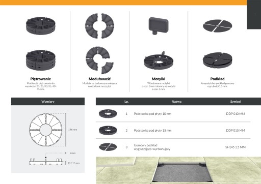 - Wsporniki można układać na betonie bez izolacji, na asfalcie, na pokryciu hydroizolacyjnym lub innych podłożach o podobnej stabilności.