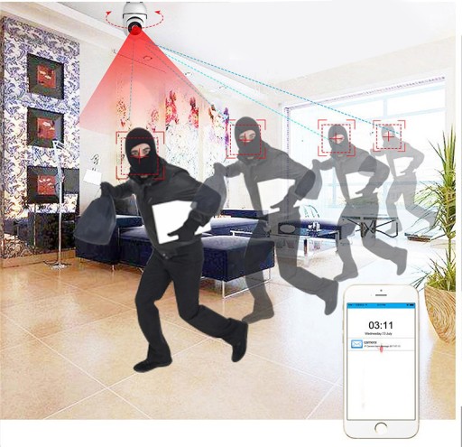 W sytuacji gdy kamera wykryje ruch obraca się w kierunku detekcji, a następnie obraca się śledząc przemieszczającego się intruza.