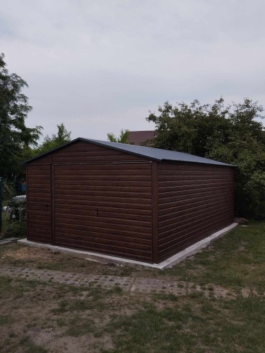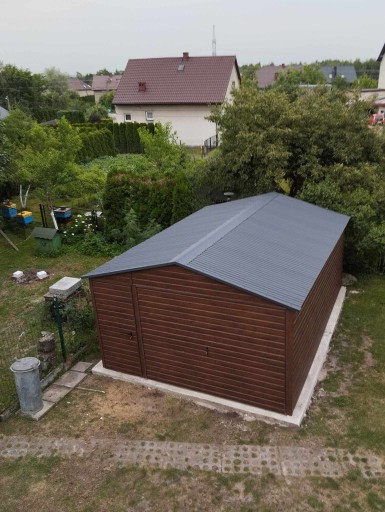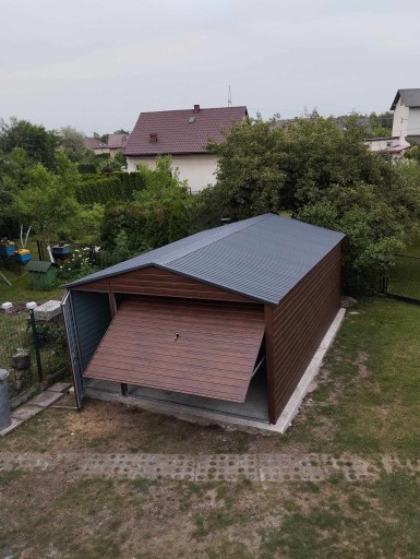 Garaż blaszany 4x6 drewnopodobny dwuspadowy, z bramą uchylną, z drzwiczkami