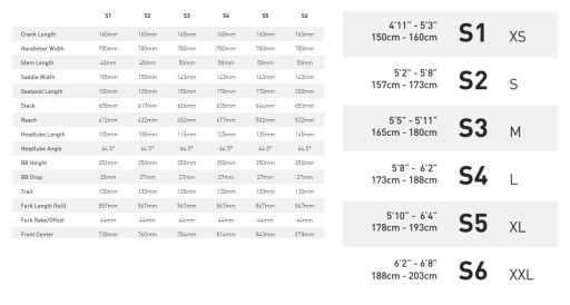 - Sztyca: X-Fusion Manic 34.9, S1: 100mm, S2: 125mm, S3: 150mm, S4/S5: 175mm, S6: 190mm