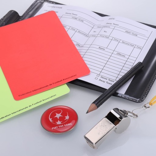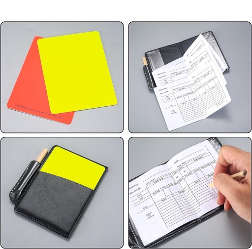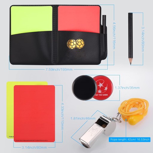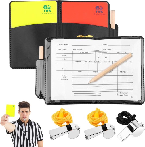 Nasz zestaw zawiera czerwoną kartę, żółtą kartkę, gwizdek + notes z ołówkiem. Może zaspokoić potrzeby sędziego piłkarskiego.