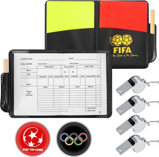 Zestaw sędziego może zawierać różne elementy, które pomagają sędziemu w prowadzeniu meczu lub zawodów sportowych. Oto przykładowy opis sprzedażowy zestawu sędziego, który obejmuje gwizdek, 2 kartki i notes