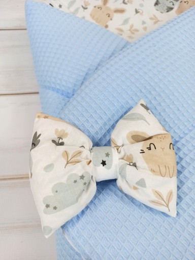 Rożek jest dwustronny - z jednej strony delikatny materiał (bawełna) wafel, z drugiej strony bawełna z przepięknym wzorem. Rożek można obrócić na drugą stronę, tak aby wzór był na zewnętrznej stronie a delikatny wafel wewnątrz.