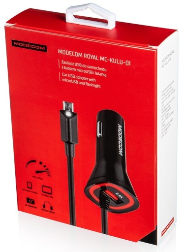 MODECOM ROYAL MC-KULU-01Zasilacz USB do samochodu MODECOM ROYAL MC-KULU-01 to ładowarka która w szybki i sprawny sposób pozwoli naładować urządzenie przenośne typu tablet lub smartfon, oraz inne urządzenia wyposażone w akumulator jak np. aparat fotograficzny lub słuchawki. Ładowarka kompaktowych rozmiarów wyposażona jest gniazdo USB oraz kabel typu microUSB. MODECOM ROYAL MC-KULU-01 ma wbudowany wskaźnik LED, który sygnalizuje pracę ładowarki oraz lampkę LED na końcu kabla która może służyć jako latarka. Ładowarka dysponuje odpowiednio dużą mocą MAX - 17,5W. Dzięki takim rozwiązaniom podłączone urządzenia mobilne ładowane są w najbardziej efektywny z możliwych sposobów.