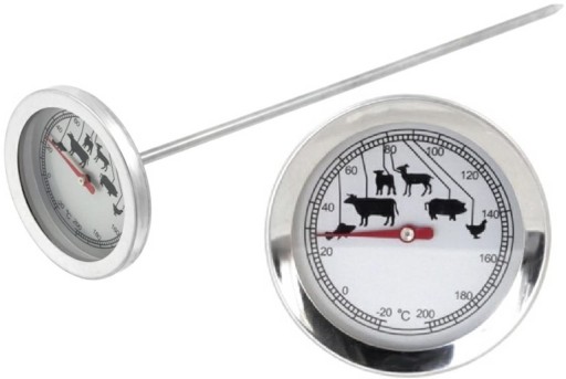 Stalowy termometr analogowy z sondą - szpikulec. Doskonale nadaje się do kontrolowania temperatury grilla, wędzarni, szynkowaru oraz do piekarników gazowych i elektrycznych. Niezbędne narzędzie gdy kuchenka nie ma wbudowanego wskaźnika temperatury.