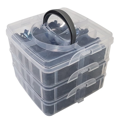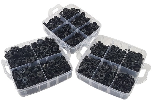 Zestaw 625 ELEMENTÓW, w skład którego wchodzi 18 najpopularniejszych rozmiarów klipsów i łączników mocujących.
