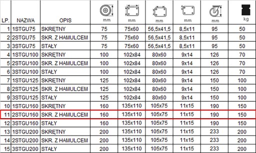 Zestaw składa się z czterech kółek wyposażonych w mocowanie na płytkę. W skład zestawu wchodzą cztery koła z hamulcem o kodzie 2STGU160 (poz.11 w tabeli).