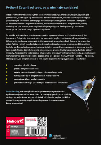 Przez ostatnie trzydzieści lat Python intensywnie się rozwijał. Stał się dojrzałym językiem programowania, nadającym się do tworzenia zarówno niewielkich, wyspecjalizowanych narzędzi, jak i złożonych systemów. Zakres jego możliwości poszerzają liczne biblioteki i narzędzia. Ta wszechstronność i bogactwo stanowią jednak duże wyzwanie dla programistów, którzy chcieliby nie tyle poznać poszczególne funkcje tego języka, ile dogłębnie go zrozumieć i nauczyć się "pythonicznego" sposobu myślenia.