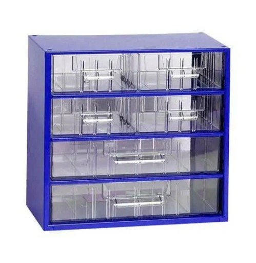 Szafka 2 rozmiary 4s, 2v 6768 30,6x28cm metal Szafka wykonana z blachy stalowej i pokryta trwałą powłoką proszkową. Nadaje się do przechowywania elementów złącznych, drobnych elementów i komponentów lub mniejszych narzędzi. Przezroczyste plastikowe szuflady wykonane są z mocnego i trwałego materiału (styropian). Szafkę można dowolnie budować, ustawiać na innych szafkach lub nawet powiesić na ścianie. Podstawa wyposażona jest w plastikowe nóżki. Sprzedajemy w wariantach niebieskim i czerwonym. Parametry: Wymiary: 306x282x155 mm (długość / wysokość / szerokość) Typ szuflady: 4xB, 2xC Rozmiar szuflady typ B: 136x57x136 mm (długość / wysokość / szerokość) Rozmiar szuflady typ C: 276x57x136 mm (długość / wysokość / szerokość) Materiał: Metal / Plastikowy kolor: niebieski lub czerwony