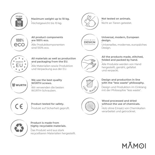 - Produkt przeznaczony jest do samodzielnego montażu wedle załączonej instrukcji. Przed rozpoczęciem użytkowania należy sprawdzić solidność wieszaka. Elementy drewniane można czyścić przy pomocy delikatnych preparatów i lekko zwilżonej ściereczki, materiał można prać.