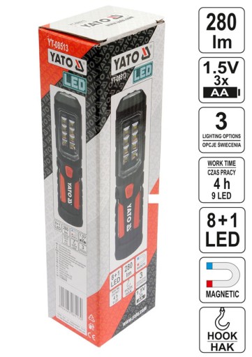 Diodowa lampa warsztatowa marki YATO, posiada 8+1 diod LED. Generuje strumień światła o natężeniu 280lm.