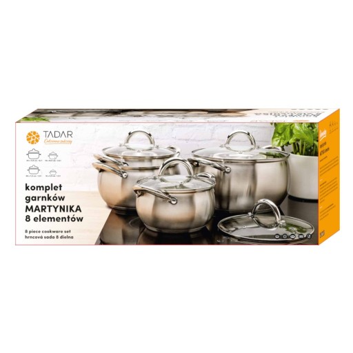 Komplet garnków Martynika 8 elementów, - garnek, pojemność: 2,2 l, średnica: 16 cm, średnica pola grzewczego: 13 cm, wysokość bez pokrywy: 10 cm, - garnek, pojemność: 2,9 l, średnica: 18 cm, średnica pola grzewczego: 15 cm, wysokość bez pokrywy: 11 cm, - garnek, pojemność: 3,9 l, średnica: 20 cm, średnica pola grzewczego: 17 cm, wysokość bez pokrywy: 12 cm, - garnek, pojemność: 5,5 l, średnica: 24 cm, średnica pola grzewczego: 21 cm, wysokość bez pokrywy: 14 cm, - 4 szklane pokrywki o dopasowanej średnicy do wybranego garnka