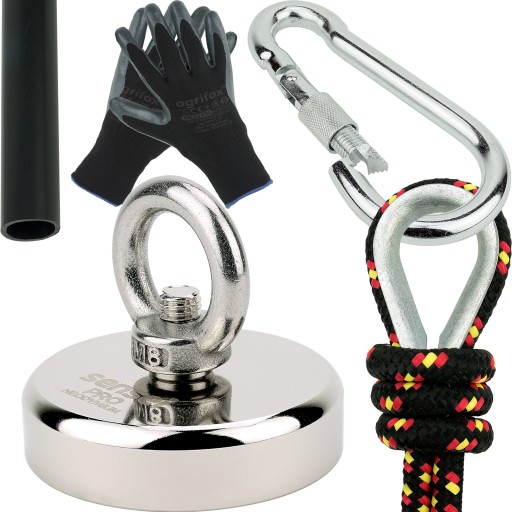 Magnes neodymowy Sensei 150 kg z uchwytem + lina 25 m + kausza + karabińczyk + rurka termokurczliwa + rękawiczki