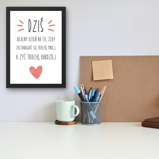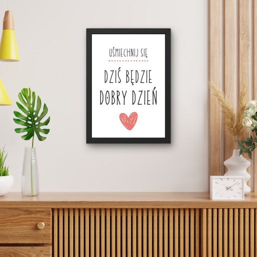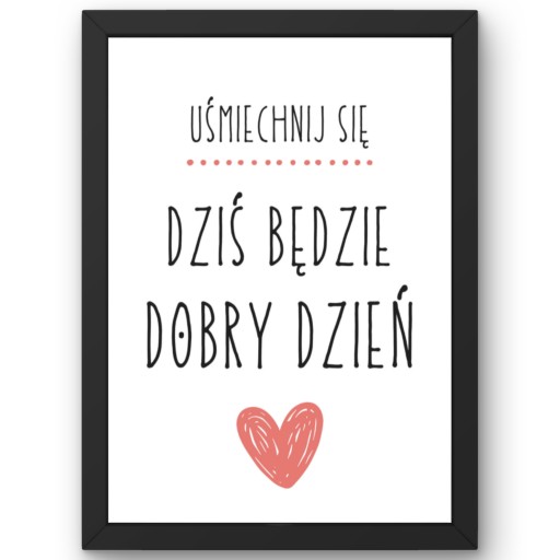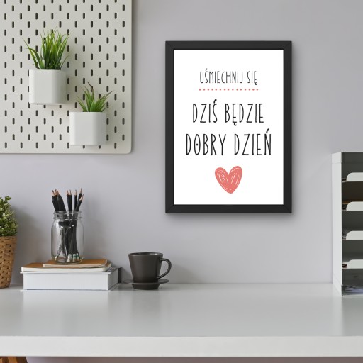 - Oferta dotyczy obrazu z napisem "Uśmiechnij się. Dziś będzie dobry dzień" w czarnej matowej ramie (może wisieć lub stać) o wymiarach 33 x 24 cm.