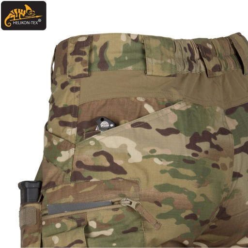 Helikon Urban Tactical Flex Shorts to najnowsze spodenki taktyczne, który czerpią sprawdzone rozwiązania z bestselerowego modelu UTP. Spodenki zachowują pełną funkcjonalność, ponieważ ilość oraz układ kieszeni jest niemal identyczny jak w spodnieahc URban Tactical Flex. Materiał główny stanowi oryginalny Mil-Spec NyCo Rip-Stop w kamuflażu MultiCam, który ceniony jest za wysoką odporność na uszkodzenia mechaniczne. Dodatkowo, aby zapewnić wysoką mobilność oraz komfort użytkowania w kroku oraz w karczku wszyte są kliny wykonane z elastycznej tkaniny nylonowej VersaStretch®. Optymalne rozmieszczenie i wielkość kieszeni pozwala przenosić podstawowy ekwipunek blisko środka ciężkości – wokół bioder i pasa. Krawędzie kieszeni przednich i tylnych są dodatkowo wzmocnione. Dwie kieszonki na przodzie ud zapinane na rzep, idealnie spisują się do przenoszenia smartfona i są wystarczająco duże aby umieścić w nich nawet magazynek AR/AK. Boczne kieszenie udowe zapinane na suwak na pierwszy rzut oka są płaskie, ale ich konstrukcja sprawia, że bez najmniejszego problemu można w nich przenosić całkiem spore przedmioty takie jak portfel.