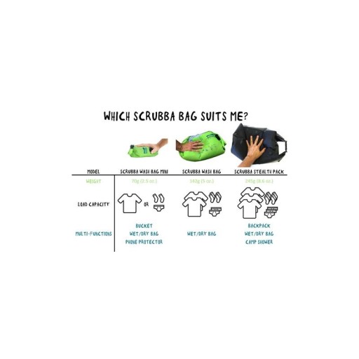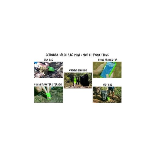 Scrubba Wash Bag Mini to wodoszczelny worek, który służy jako przenośna pralka turystyczna podczas długich wypraw z plecakiem, wyjazdów w dalekie strony lub wakacji z rodziną. Wystarczy trochę wody i proszku lub płynu do prania, żeby nawet w najdłuższej podróży czy gdzieś na końcu świata cieszyć się czystym ubraniem lub czystą bielizną. Worek doskonale sprawdza się również w przypadku rodzin przebywających na wakacjach z dziećmi, które, jak wiadomo, często brudzą swoją odzież. Oprócz tego może służyć do transportu wilgotnych lub do przechowywania suchych ubrań, a także jako pojemnik do transportu wody lub jako pokrowiec na sprzęt elektroniczny.