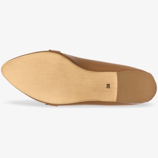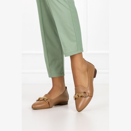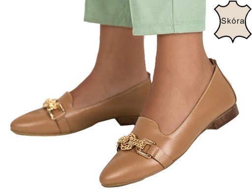 - modne lordsy damskie z ozdobą, w pięknym camelowym odcieniu