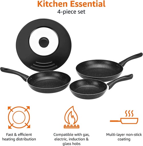 Amazon Basics 4-częściowy zestaw patelni z aluminium z powłoką zapobiegającą przywieraniu, do kuchenek indukcyjnych, z uniwersalną pokrywą, nie zawiera PFOA i BPA, 20, 24, 28 cm