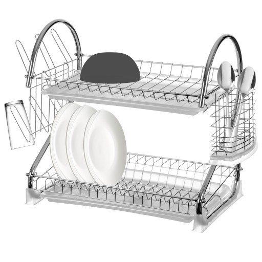 Wysoka jakość, trwała i metalowa konstrukcja to atrybuty tego ociekacza. Dwie tacki wykonane z żywicy zabezpieczają blat przed zamoczeniem. Zestaw zawiera również plastikowy, dwukomorowy ociekacz na sztućce. Metalowa suszarka jest eleganckim rozwiązaniem do każdej kuchni.